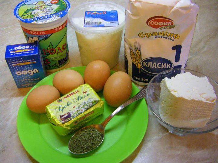 4 ЯЙЦА, 1 ЧАЕНА ЧАША КИСЕЛО МЛЯКО, 1 ЧАЕНА ЧАША СВИНСКА МАС (КРАВЕ МАСЛО), 1 ЧАЕНА ЛЪЖИЦА СОЛ, 1 ЧАЕНА ЛЪЖИЦА СОДА БИКАРБОНАТ, 200 ГР СИРЕНЕ, 1 СУПЕНА ЛЪЖИЦА ЧУБРИЦА, ОКОЛО 800-900 ГР БРАШНО, 1 ЧАЕНА ЛЪЖИЦА С ВРЪХ МАСЛО ЗА ДУПЧИЦИТЕ НА ПИТКИТЕ.