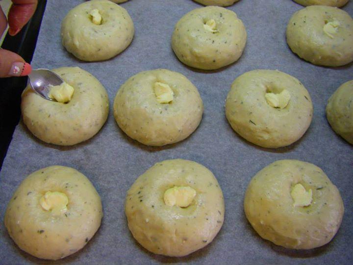 В ДЪЛБОКА КУПА СМЕСВАМЕ ЯЙЦАТА СЪС СОДАТА БИКАРБОНАТ И СОЛТА. ПРИБАВЯМЕ КЪМ ТЯХ КИСЕЛОТО МЛЯКО, СВИНСКАТА МАС, КОЯТО Е ЛЕКО РАЗТОПЕНА , НАТРОШЕНОТО СИРЕНЕ И ЧУБРИЦАТА (КАКТО МОЖЕ ДА ВИДИТЕ ОТ СНИМКИТЕ "СТЪПКА ПО СТЪПКА") ПРЕСЯВАМЕ БРАШНОТО И ПОСТЕПЕННО ГО ПРИБАВЯМЕ КЪМ ОСТАНАЛИТЕ ПРОДУКТИ. ЗАМЕСВАМЕ МЕКО ТЕСТО. ОСТАВЯМЕ ГО ЗА 20 МИНУТИ ДА "ПОЧИНЕ". ОТ ТЕСТОТО ОФОРМЯМЕ ТОПКИ, КАТО ВСЯКА ТЕЖИ ОКОЛО 100 ГР И ГИ НАРЕЖДАМЕ В ТАВА ЗАСТЛАНА С ХАРТИЯ ИЛИ НАМАСЛЕНА. В СРЕДАТА НА ВСЯКА ТОПКА ПРАВИМ С ПРЪСТА МАЛКА ДУПКА, В КОЯТО СЛАГАМЕ ПАРЧЕНЦЕ МАСЛО. ПЕЧЕМ НА 180 ГРАДУСА ВЪВ ФУРНАТА ДО ЗЛАТИСТ ЦВЯТ ЗА ОКОЛО 30-35 МИНУТИ. СТАВАТ МНОГО ВКУСНИ И АРОМАТНИ. ПРОБВАЙТЕ И СПОДЕЛЕТЕ. ДА ВИ Е СЛАДКО.