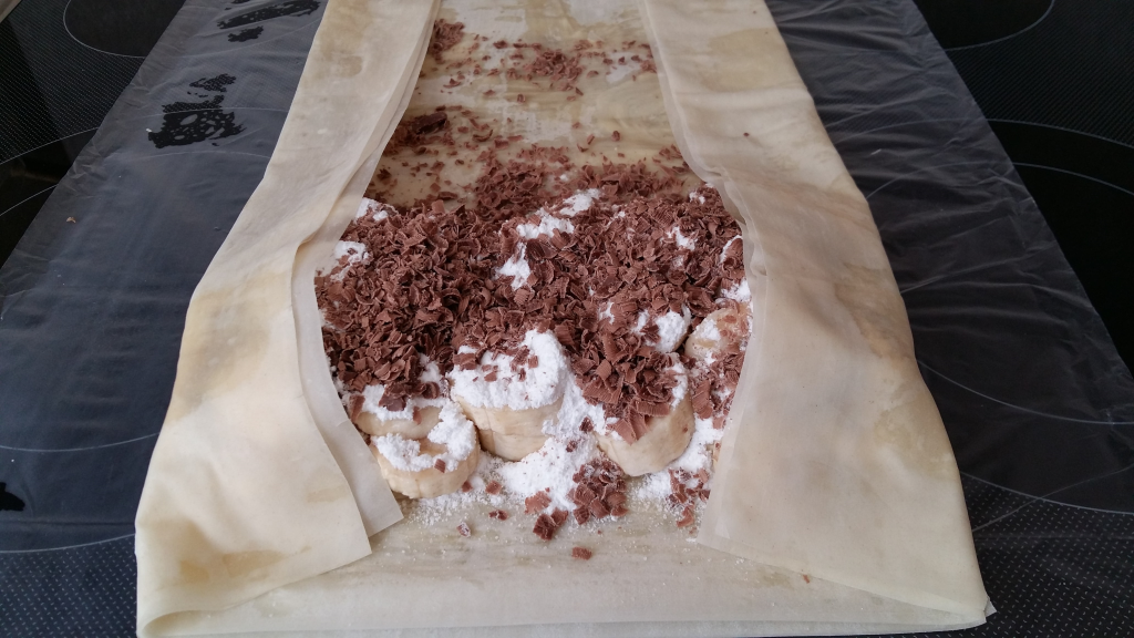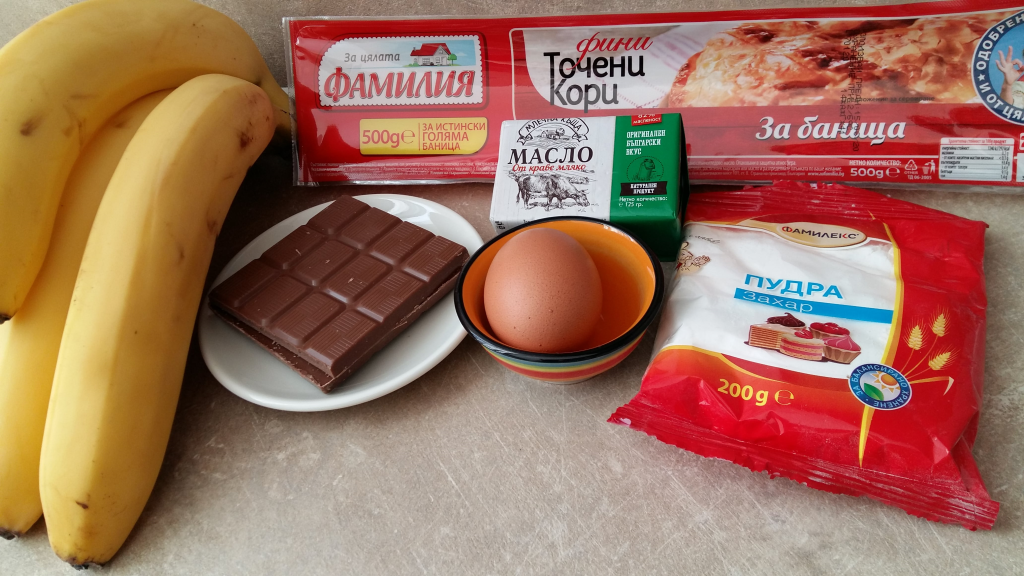 Шоколадът се настъргва на едро ренде. Бананите се обелват и се нарязват на шайби. Четирите листа точени кори се намазват с разтопеното масло и се нареждат един върху друг. Шайбите банан се слагат върху намазаните кори от към тясната част като се оставя 1-2 см от към двете страни за загъване и се поръсват със захар. Добавя се настърганият шоколад и корите се завиват на руло. Рулото се поставя в тава и с помощта на нож се правят няколко напречни разреза. Намазва се с масло и с разбито с 1 чаена лъжица вода яйце и се пече 20 минути в предварително загрята на 200 градуса фурна до златист цвят. Оставете да се охладят и ги поръсете с пудра захар. Страхотен вкус на масло, банан и шоколад. Пробвайте и споделете. Да ви е сладко!