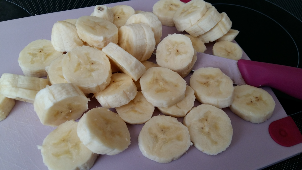 Бананите се обелват и се нарязват на шайби.
