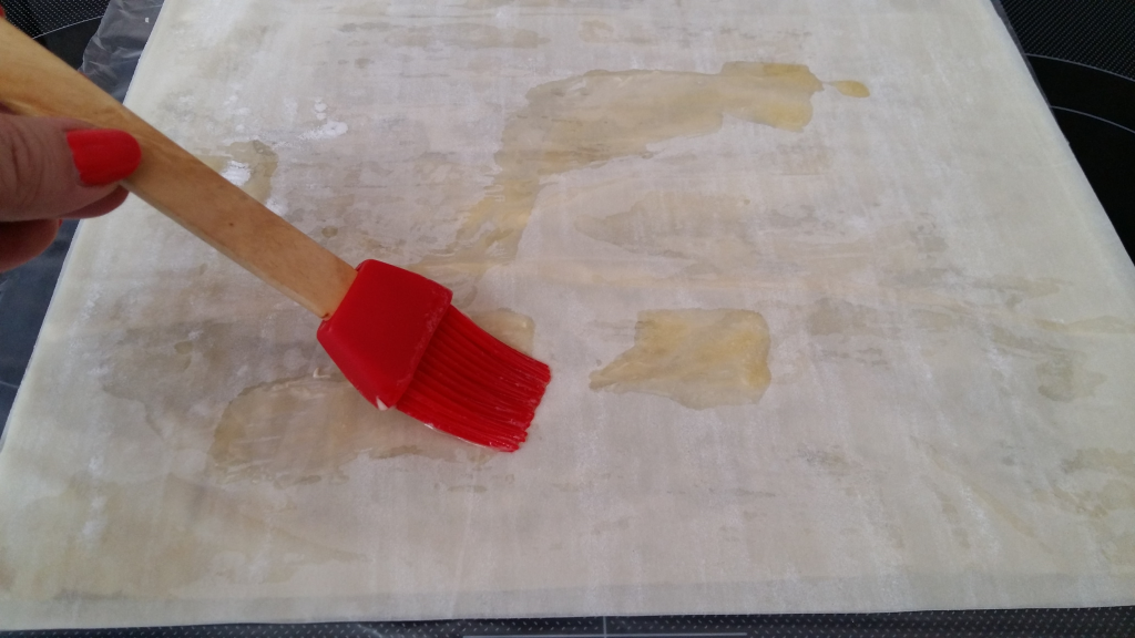 Четирите листа точени кори се намазват с разтопеното масло и се нареждат един върху друг.