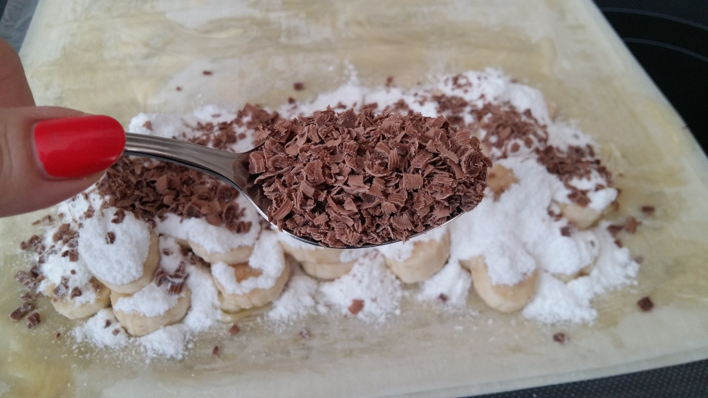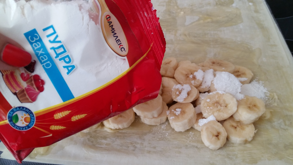 Шайбите банан се слагат върху намазаните кори от към тясната част като се оставя 1-2 см от към двете страни за загъване и се поръсват със захар.