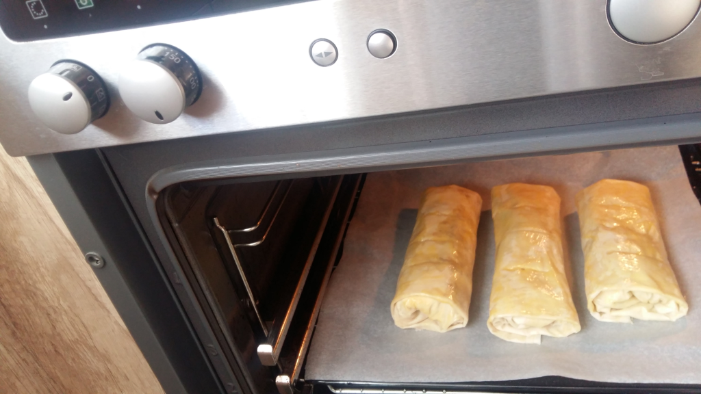 и се пече 20 минути в предварително загрята на 200 градуса фурна.