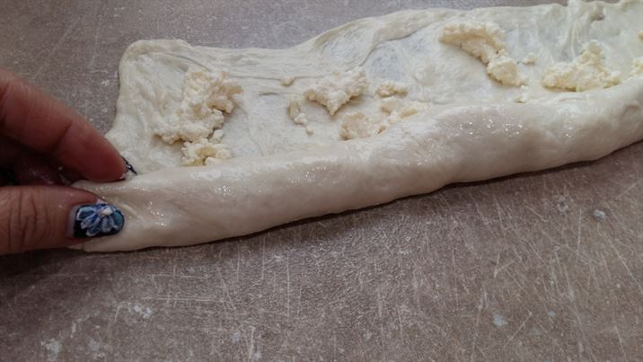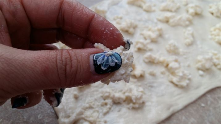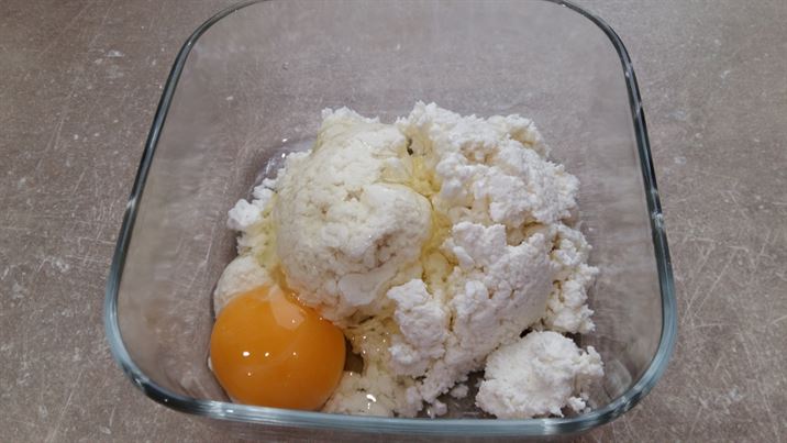 През това време си приготвяте плънката като смесвате сиренето с изварата и яйцето до еднородна смес.