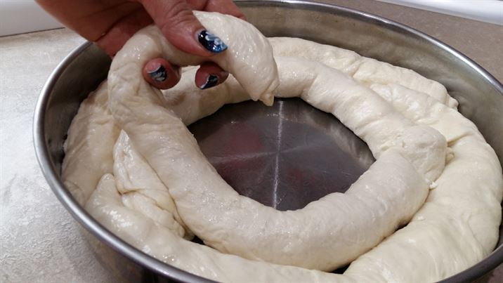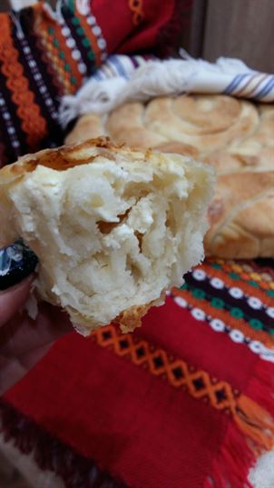 Към хладката вода прибавете маята, захарта и една чаена лъжица брашно. Оставете за 10-15 минути да се надигне. Вподходящ дълбок съд пресейте една част от брашното и към него прибавете солата, капките оцет и шупналата мая. Добавете постепенно останалата част от брашното, и месете докато престане да лепне и стане гладко и еластично тесто. Тесто си разделете на 5 топки, като всяка трябва да тежи около 190 гр. Всяка топка разточете на кръг с приблизителен диаметър 25 см. Намажете ги с олио и ги сгъвайте на плик (както може да видите от снимките "стъпка по стъпка"). Покрийте ги с кърпа и ги оставете за около 30 минути да втасат. През това време си приготвяте плънката като смесвате сиренето с изварата и яйцето до еднородна смес. Втасалите пликове дърпайте с ръце на кръг с приблизителен диаметър 25 см. Намажете ги с олио и ги поръсете с част от плънката. Завийте ги на руло, като едновременно ги разтягате да станат малко по-дълги . Наредете ги в намазана с олио тава. Баницата печете в предварително загрята фурна на 180 градуса около 45 минути. След като я извадите от фурната, напръскайте с малко водичка, покрийте я с кърпа и я оставете за 10 минути , преди да я разчупите. Пробвайте и споделете. Да ви е сладко!