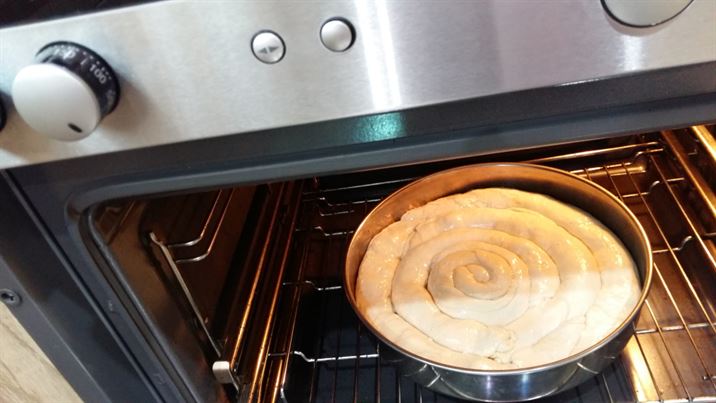 Баницата печете в предварително загрята фурна на 180 градуса около 45 минути.