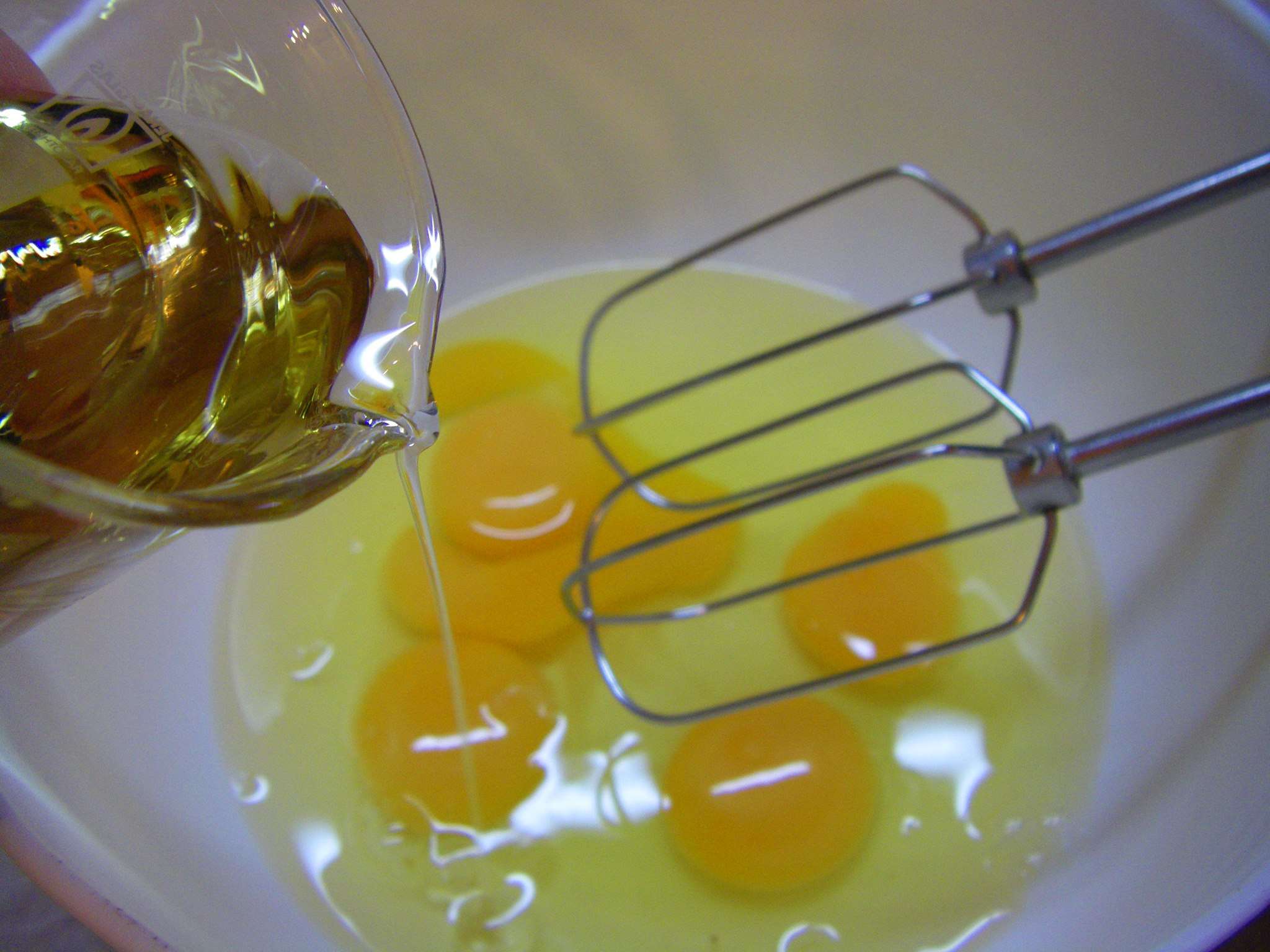 В ПОДХОДЯЩА ДЪЛБОКА КУПА РАЗБИЙТЕ ЯЙЦАТА, ПРИБАВЕТЕ ОЛИОТО