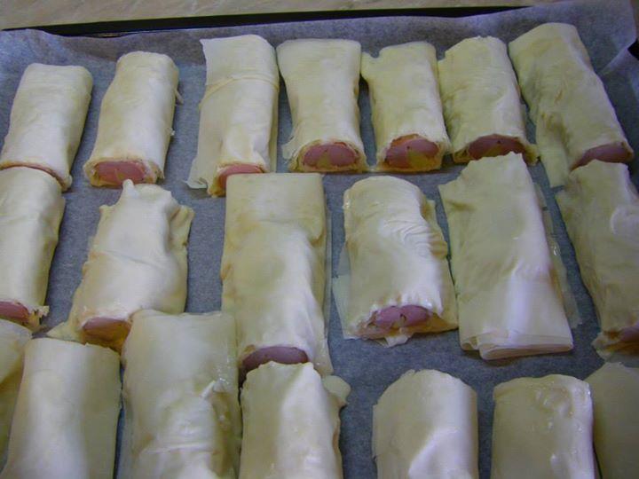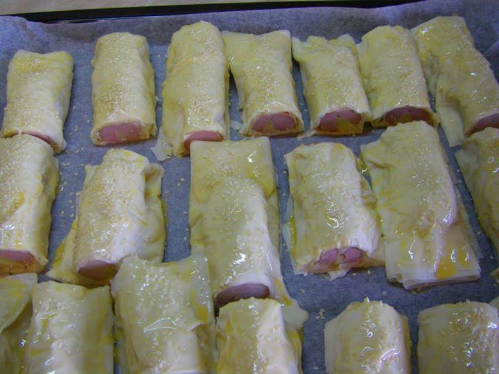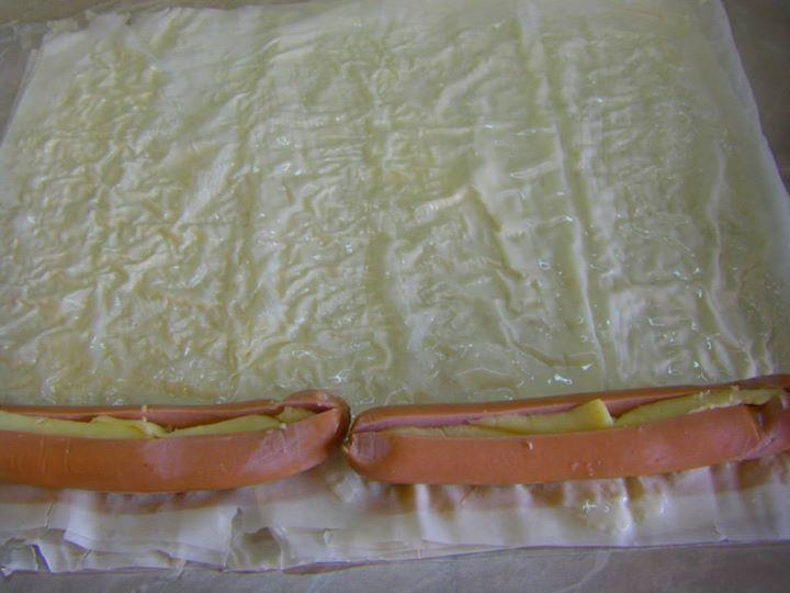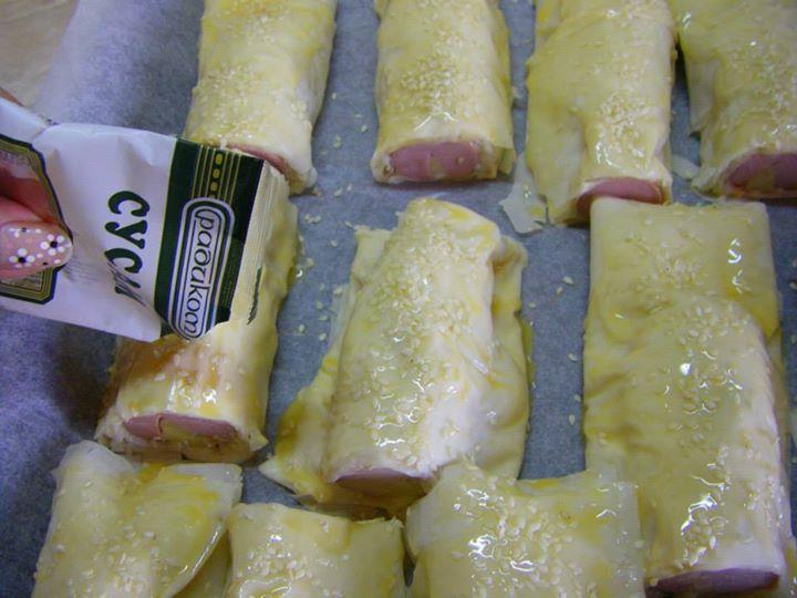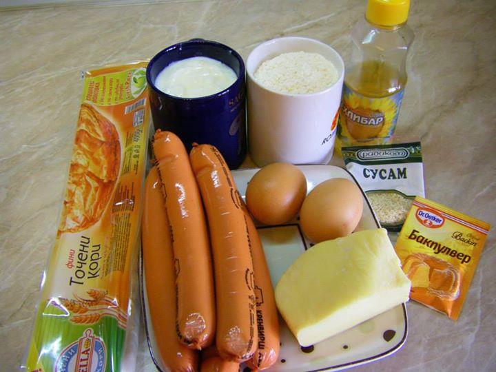 1 ПАКЕТ КОРИ ЗА БАНИЦА, 2 ЯЙЦА, 1 ЧАША ЧАША КИСЕЛО МЛЯКО, 1/2 КАФЕНА. ЛЪЖИЦА СОЛ, 1 ЧАЕНА ЧАША БРАШНО, 50 МЛ ОЛИО, 1 БАКПУЛВЕР, 8-9 КРЕНВИРША, ОКОЛО 100 ГР КАШКАВАЛ, 1 ЖЪЛТЪК, СУСАМ.