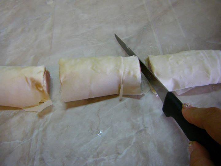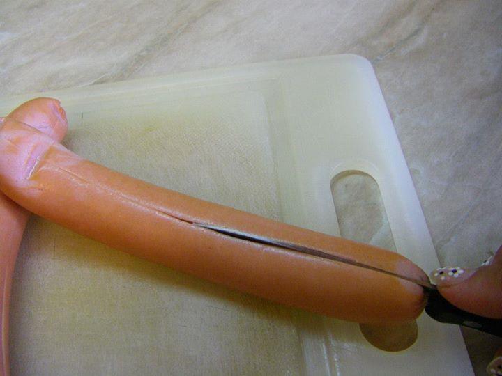 ОБЕЛВАМЕ КРЕНВИРШИТЕ , СЛЕД ТОВА ВСЕКИ КРЕНВИРШ ГО СРЯЗВАМЕ ПО ДЪЛЖИНА С ОСТЪР НОЖ, КАТО ЦЕЛТА Е ДА НЕ СЕ РАЗПОЛОВИ, А ДА СЕ СРЕЖЕ