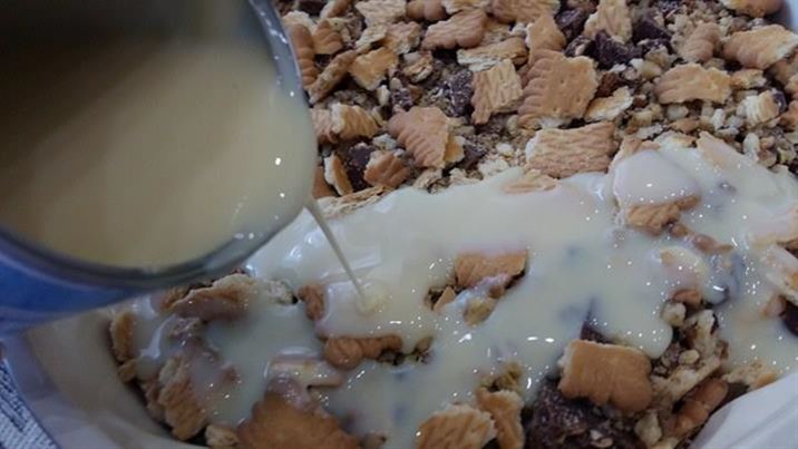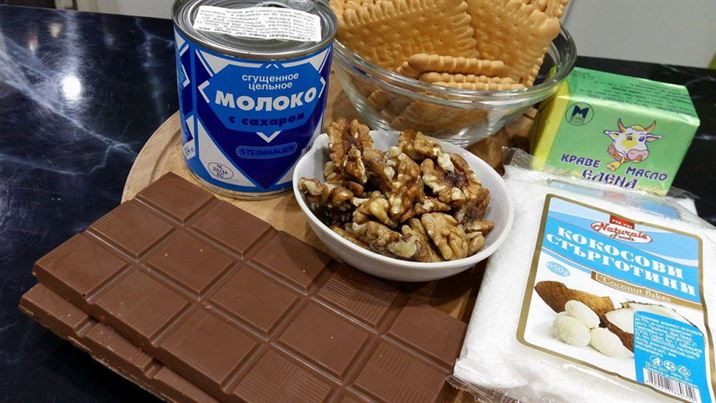 Разтопете маслото в подходящ съд на котлона. Изсипете го на дъното на тавичка с размер от 26 см. Натрошете на едро бисквитите и отделете една малка купичка от тях, а останалите разпределете върху маслото. Върху тях наръсете кокосовите стърготини, след това начупения на парченца шоколад. Поръсете с орехите и с отделените бисквити и полейте равномерно навсякъде с кондензираното мляко. Печете в загрята фурна на 180С за около 20 минути. Пробвайте и споделете. Да ви е сладко!