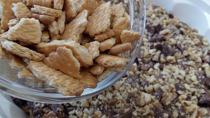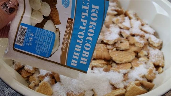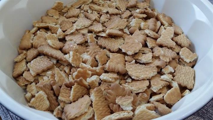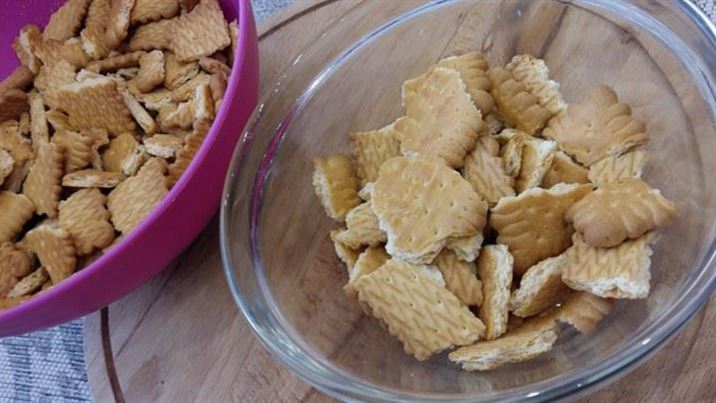 Натрошете на едро бисквитите и отделете една малка купичка от тях