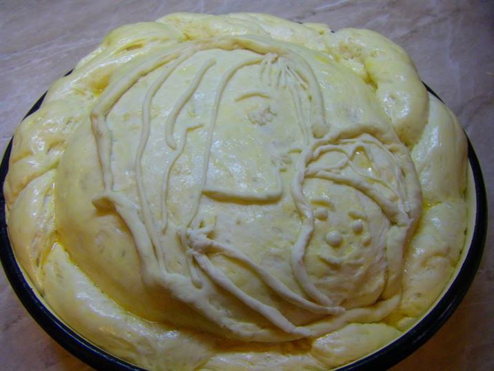 Оставете под кърпа да почине 5-10 минути.През това време омесете тестото за украсата на питката,така нареченото солено тесто:Смесете 1/2 чаена лъжица сол с 1/2 чаена чаша вода и брашно за твърдо тесто (около 200 гр ).Намажете питата с един разбит жълтък,като към него сте прибавили малко олио и малко прясно мляко.Изберете си подходяща фигура,нанесете я с молив или принтиране върху лист хартия и го поставете в средата на питата.Вземете от соленото тесто,разтеглете дълъг,тъничък фитил и оформете външната част на фигурата.Махнете листа и с тънки фитили,гледайки от картинката с помощта на вашата фантазия оформете останалата вътрешна част.След това сложете питата да се пече в загрята на 180 градуса фурна,като фигурата не се мажете с яйце (целта е да остане светла и да се откроява от останалата част на питата отгоре).Печете питата за около 40 минути.Готовата погача намажете още топла с разтвор от 1 чаена лъжица олио и 1/2 чаена лъжица вода.Питата става вкусна и много пухкава.
