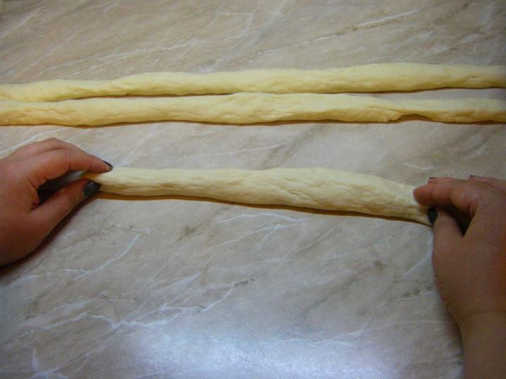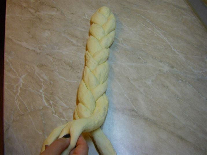 Останалото тесто разделете на 3 еднакви части, оформете дълги фитили (както може да видите от снимките "стъпка по стъпка") сплетете питка.