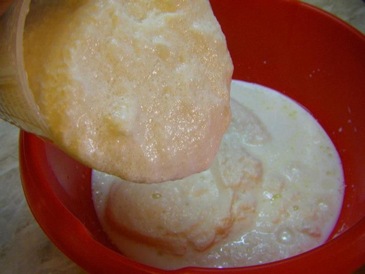 Разтворете маята и захарта в 200 мл топло прясно мляко, покрийте и оставете да втаса за 15 минути.В голяма купа изсипете течните продукти и втасалата мая, разбъркайте.
