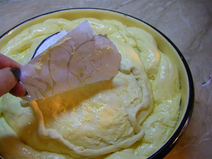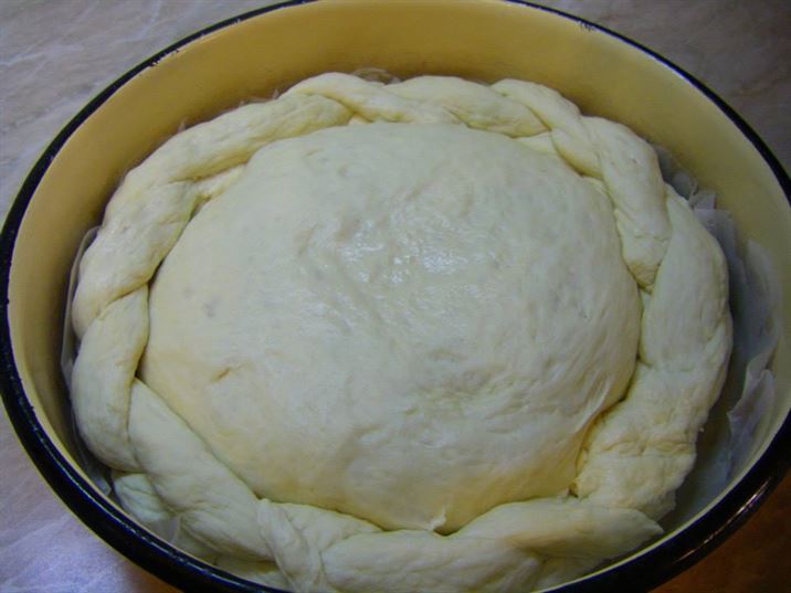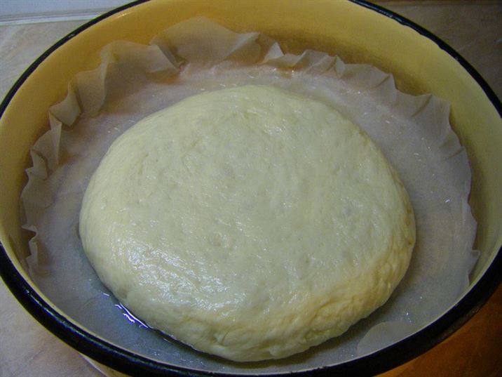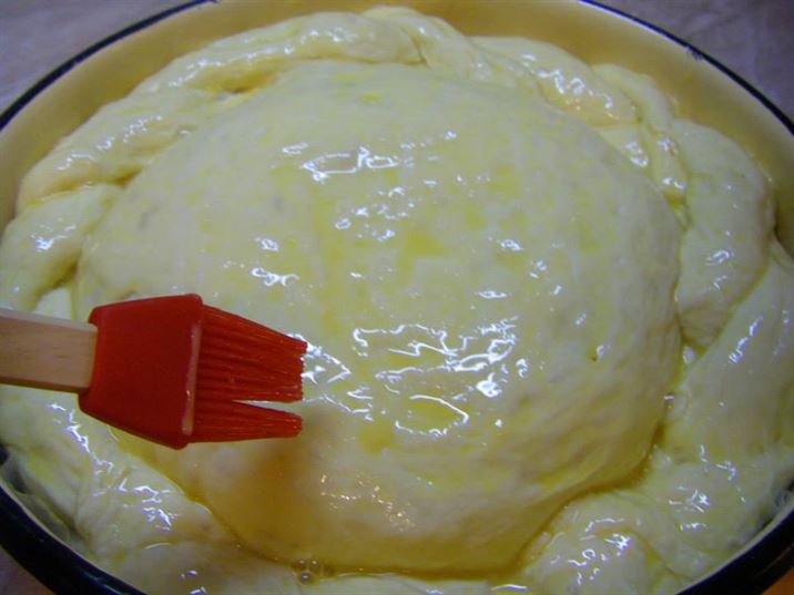 Намажете с мазнина голяма купа и тестото, покрийте ги с кърпа и оставете на топло да втаса до удвояване на обема.
