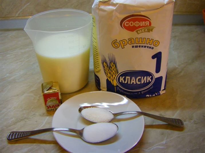 около 1 кг брашно,40 гр жива мая,1 и 1/2 супена лъжица захар,1 супена лъжица оцет (така тестото става по-разтегливо и еластично),2 супени лъжици олио,1 супена лъжица с връх сол,