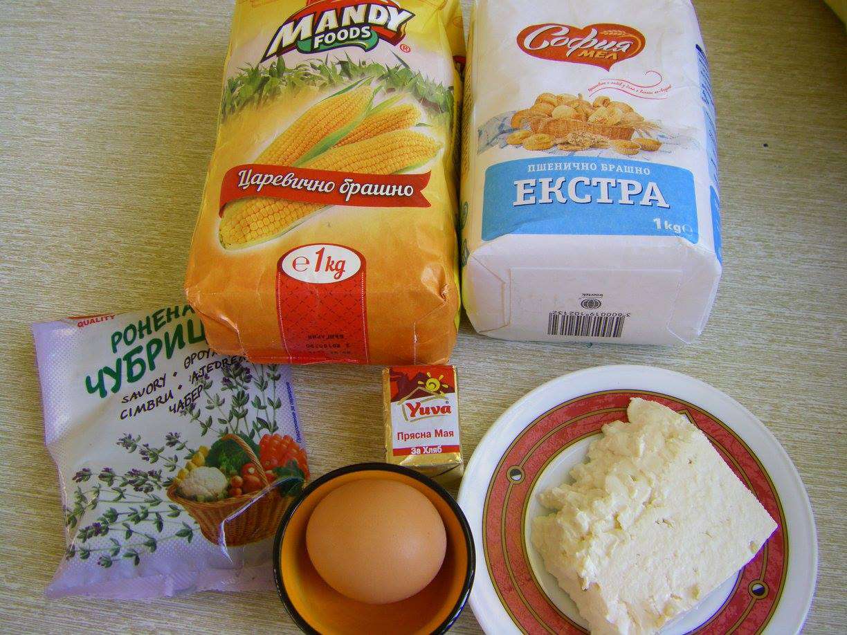 40 ГР МАЯ, 500 МЛ ЛЕКО ТОПЛА ВОДА, 200 ГР ЦАРЕВИЧНО БРАШНО, 500 ГР БЯЛО БРАШНО, 1 РАВНА СУПЕНА ЛЪЖИЦА ЗАХАР, 2-3 СУПЕНИ ЛЪЖИЦИ ОЛИО, 1 РАВНА СУПЕНА ЛЪЖИЦА СОЛ, 150-200 ГР СИРЕНЕ, МАЛКО БРАШНО ЗА ДОИЗМЕСВАНЕ, РОНЕНА ЧУБРИЦА ЗА РЪСЕНЕ, ЕДИН РАЗБИТ ЖЪЛТЪК ЗА НАМАЗВАНЕ И ОЛИО ЗА НАМАЗВАНЕ.