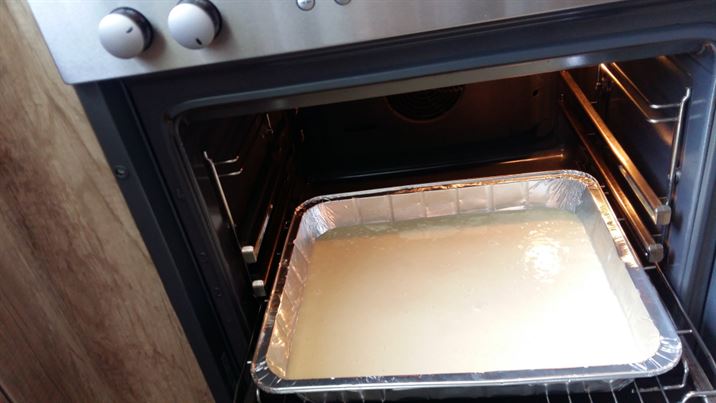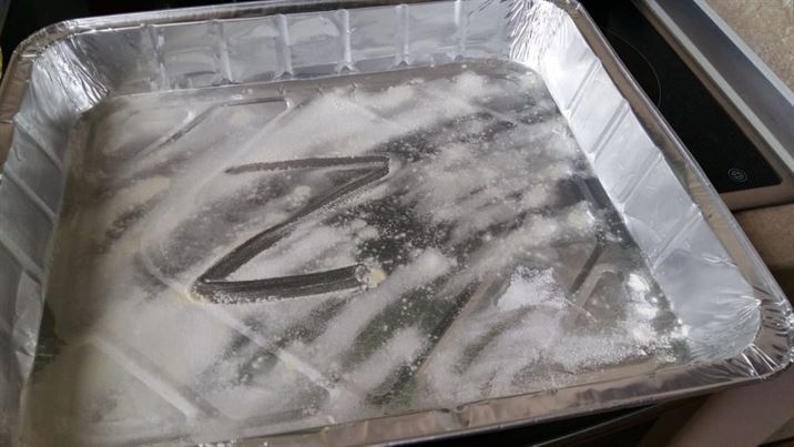 В тава с размери 36Х30 см (може и по-малка, но блата ще стане по дебел) намазвате с мазнина, поръсвате с малко брашно и с пръст по средата както може да видите от снимката изписвате буквата Z така няма никога да ви залепва сладкиша след изпичане за тавата.