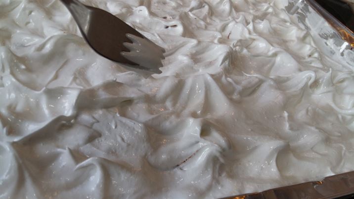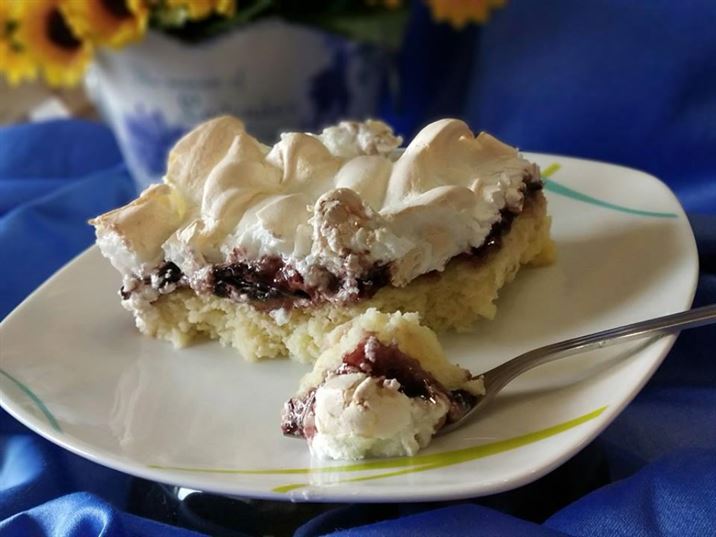 Разделяте яйцата на жълтъци и белтъци. С помощта на миксер разбивате добре всички продукти за блата жълтъците, захарта, киселото мляко и ванилията. Разбивате, докато сместа стане еднородна, след което добавяте брашното с бакпулвера , содата бикарбонат и отново разбивате добре. В тава с размери 36Х30 см (може и по-малка, но блата ще стане по дебел) намазвате с мазнина, поръсвате с малко брашно и с пръст по средата както може да видите от снимката изписвате буквата Z така няма никога да ви залепва сладкиша след изпичане за тавата. Изсипвате сместа и печете в предварително загрята на 180 градуса фурна за около 25-30 минути, като проверявате дали е изпечен като го бучнете с клечка, ако е суха, то блатът е готов. Изваждате блата и след 3-4 минути го намазвате със сладкото. Може да ползвате както мармалади, така и сладко. За целувчената смес с помощта на миксер разбивате белтъците заедно със захарта, капките оцет и ванилията до получаване на твърда смес която като обърнете купата не трябва да пада. Разпределяте я върху мармалада и с помощта на виличка надигате целувчената смес като пламъци на свещ печете за 5-6 минути в предварително загрята на 220 градуса фурна само на горен реоан до бледо кафяв цвят. След като го извадите от фурната оставете да се охлади и след това го нарежете по ваше желание. Пробвайте и споделете. Да ви е сладко!