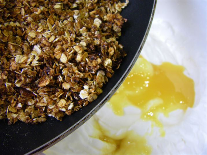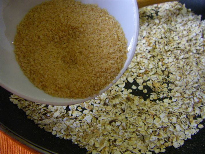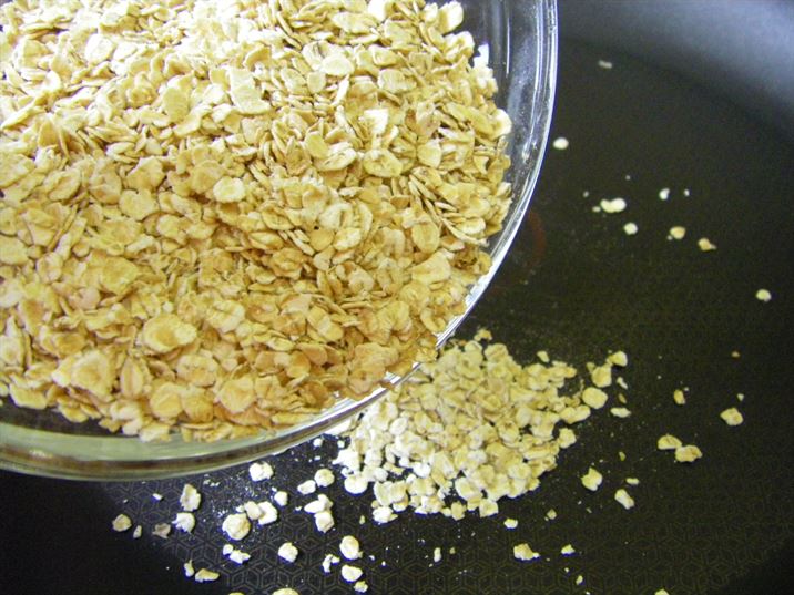 В сух тиган запечете овесените ядки, докато леко променят цвета си.