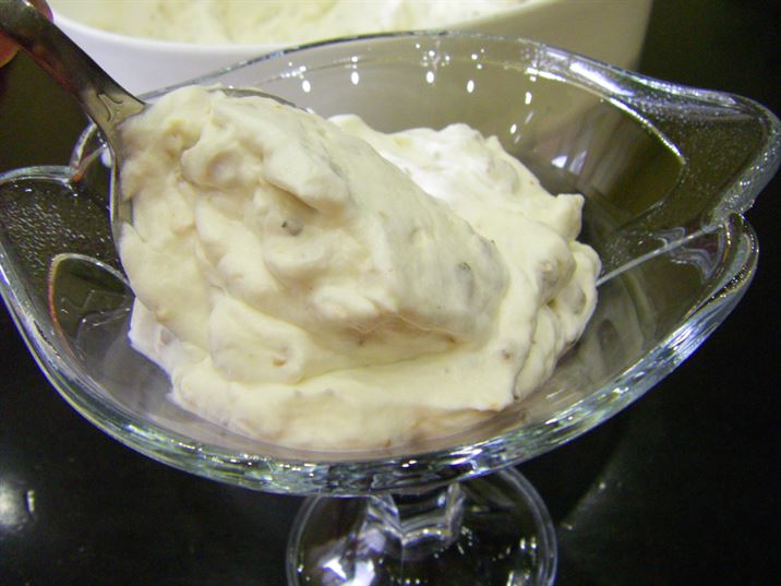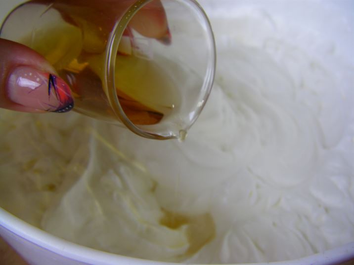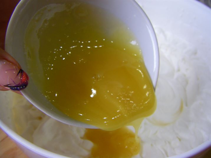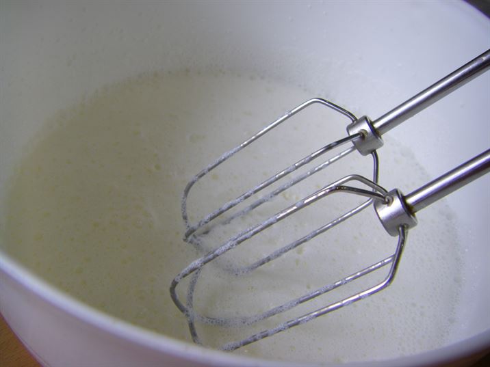 Разбийте в дълбока купа сметаната, докато се получат устойчиви връхчета