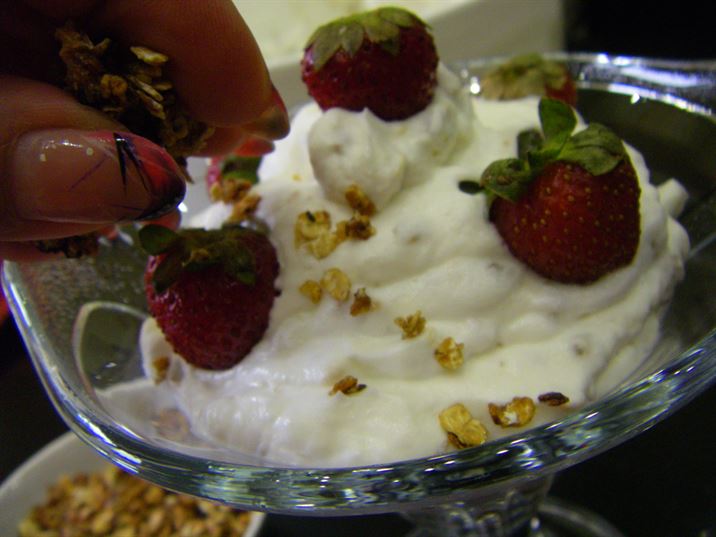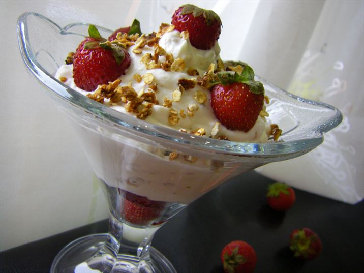Комбинацията от ягоди, сметана, овесени ядки и кафява захар просто ще ви очарова. Десертът е много свеж и изключително лесен за приготвяне, а същевременно много вкусен и ефектен, подходящ за моментите, в които трябва да спретнем нещо сладко на бързо.