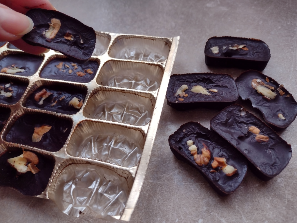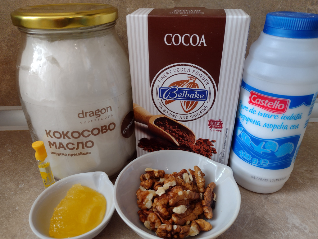Смесете в подходяща купа какаото с разтопеното кокосово масло, ванилията, щипка сол, меда и ги разбъркайте добре до еднородна смес. Налейте сместа във формички и направете бонбони, като в средата на всяко сложете по няколко орехови ядки пожелание (може и без орехи) Замразете докато стегнат около 30 минути. Дръжте шоколада в хладилника в подходящо бурканче. Според желанието ви за сладост шоколада може да бъде с :1 супена лъжица мед = около 85% черен шоколад