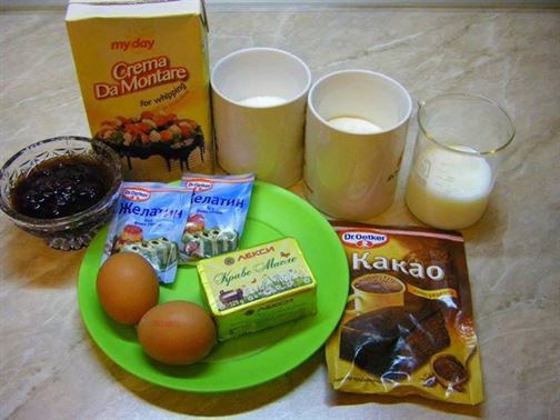 ЗА ГОЛЯМА ТОРТА С ВИСОЧИНА 7-8 СМ. ЗА БЛАТА:2 ЯЙЦА,1/2 ЧАЕНА ЧАША ЗАХАР,1/2 ЧАЕНА ЧАША БРАШНО. ЗА КРЕМА:125 ГР МАСЛО,1 ЧАЕНА ЧАША ЗАХАР,1 ЛИТЪР ТЕЧНА СМЕТАНА ЗА БИЕНЕ,1 СУПЕНА ЛЪЖИЦА КАКАО,4-5 СУПЕНИ ЛЪЖИЦИ СЛАДКО ПО ВАШЕ ЖЕЛАНИЕ,20 ГР ЖЕЛАТИН,120 МЛ ПРЯСНО МЛЯКО. ЗА УКРАСА:100 ГР ШОКОЛАД.