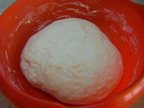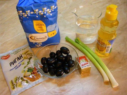 500 ГР БРАШНО, 300 МЛ ХЛАДКА ВОДА, 20 ГР ПРЯСНА МАЯ, 1 КАФЕНА ЛЪЖИЦА СОЛ, 2 СУПЕНИ ЛЪЖИЦИ ОЛИО. ЗА ПОРЪСВАНЕ: 1-2 СТРЪК ПРЕСЕН ЧЕСЪН, ОКОЛО 50-60 ГР МАСЛИНИ БЕЗ КОСТИЛКА, РИГАН.