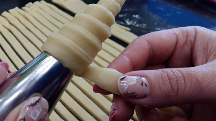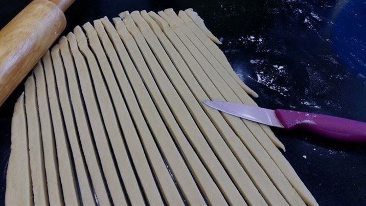 Готовото тесто се разточва с дебелина около 5 мм и се нарязва на лентички.