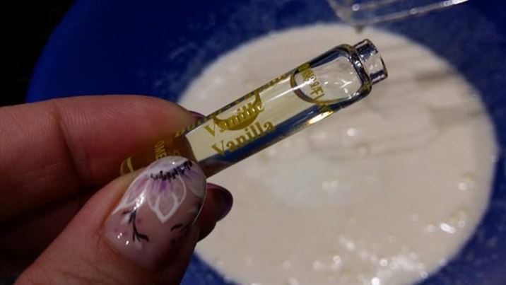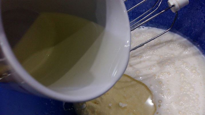 Разбиват се яйцата и захарта с миксер. След това се добавят киселото мляко, ванилията,