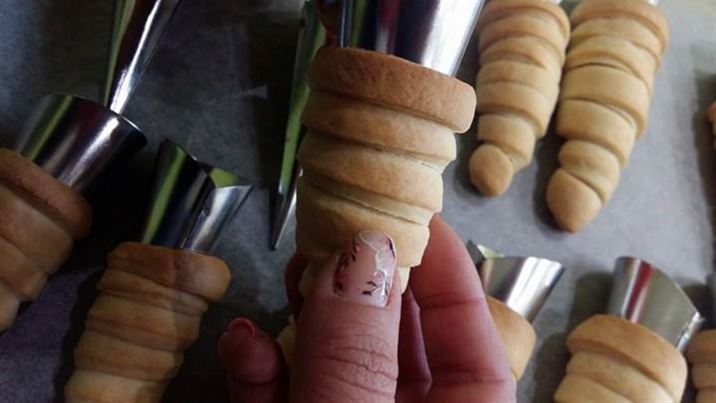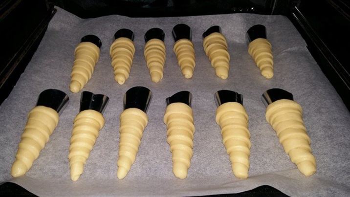 Подреждаме фунийките в тава, върху която сме поставили домакинска хартия за печене и печем в предварително загрята фурна на 180 градуса.