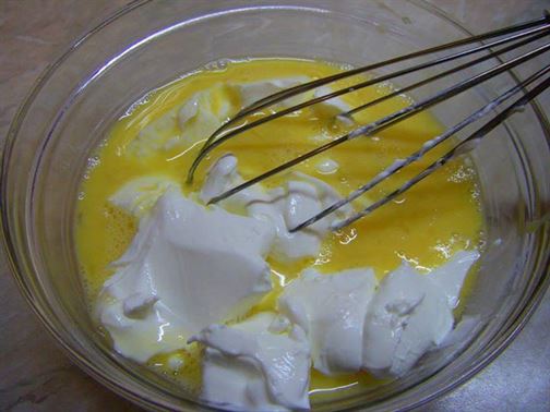 500 ГР КАЙМА, 1 ЧАЕНА ЧАША ОРИЗ, 7-8 ГЛАВИ КРОМИД, 50 МЛ ОЛИО, СОЛ НА ВКУС, 2-3 СТРЪКА МАГДАНОЗ. ЗА ЗАЛИВКАТА: 3 ЯЙЦА, 200 ГР ЗАКВАСЕНА СМЕТАНА.