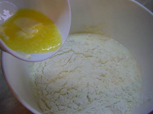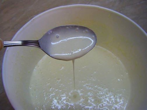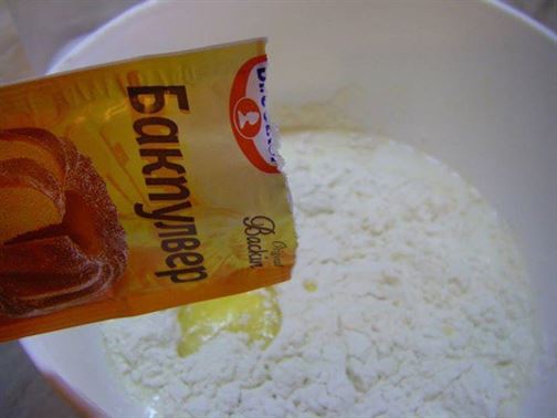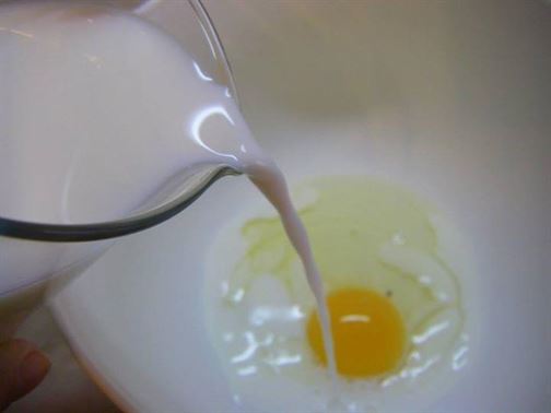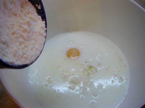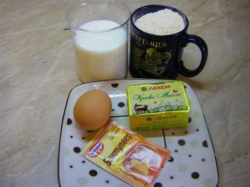 1 ЯЙЦЕ, 180 МЛ ПРЯСНО МЛЯКО, 2 СУПЕНИ ЛЪЖИЦИ МАСЛО, 1 ЧАЕНА ЧАША БРАШНО, 1/2 (5 гр) ПАКЕТ БАКПУЛВЕР.