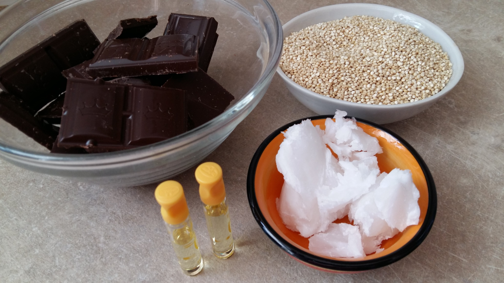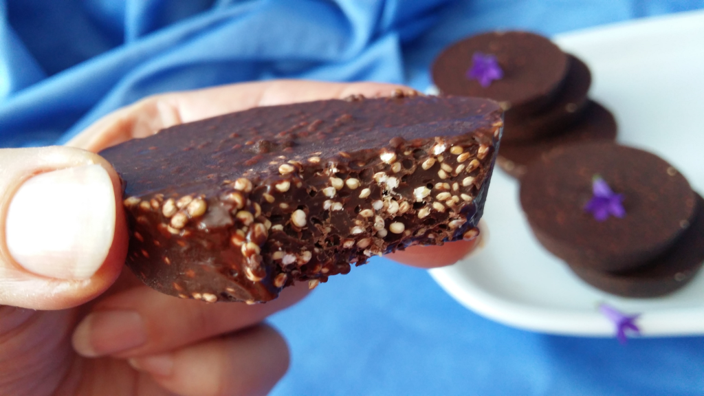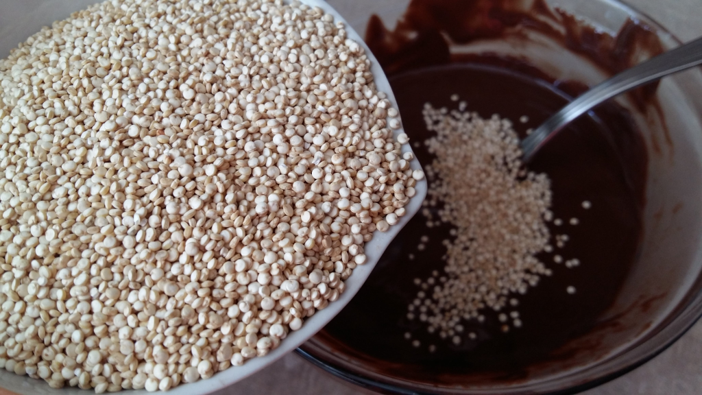 Разтопете шоколада с кокосовото масло в микровълнова фурна или на водна баня. Сложете за аромат ванилията, добавете киноата към шоколада и разбъркайте добре. След това разпределете шоколадовата смес в тавичка за мъфини. Поставете в камера или фризер за около половин час, докато шоколадът стегне. Пробвайте и споделете! Да ви е сладко!