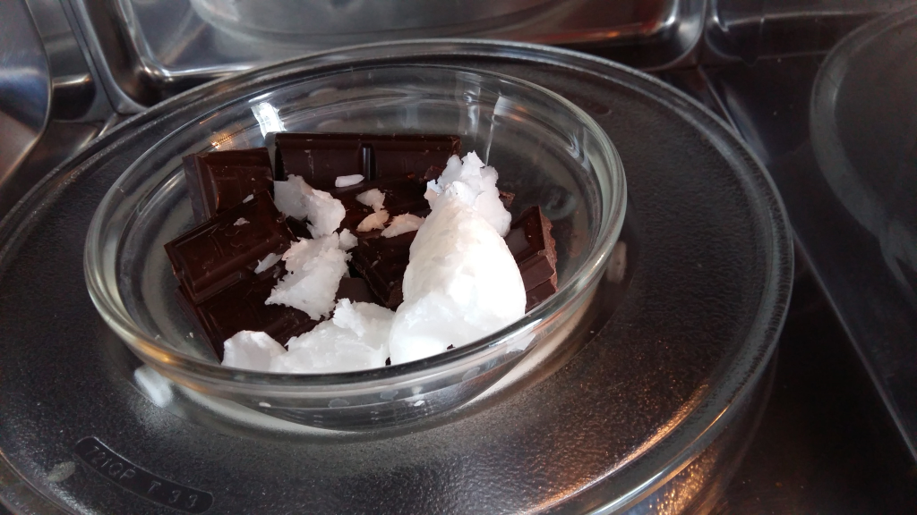 Разтопете шоколада с кокосовото масло в микровълнова фурна или на водна баня.