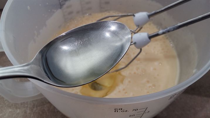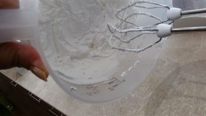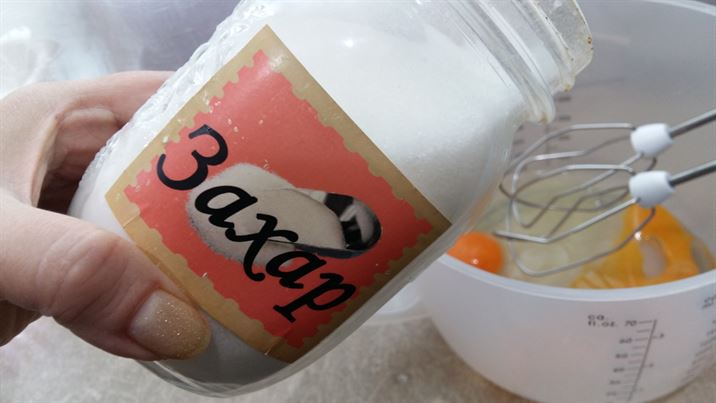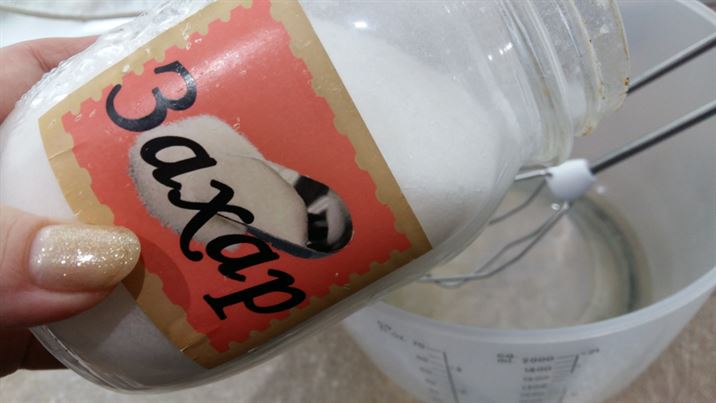 През това време в подходяща дълбока купа смесваме отделения белтък със захарта