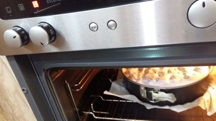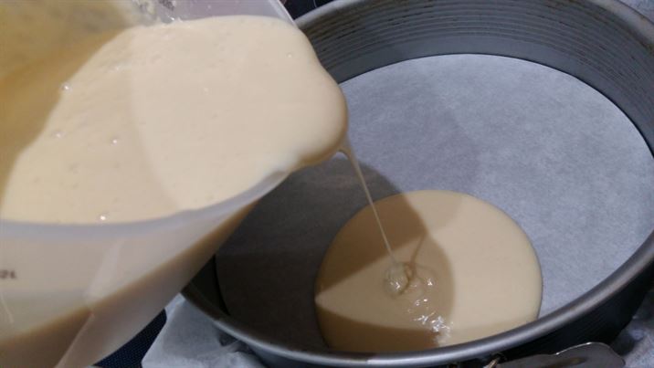Готовата смес разделяме на две. Половината изсипваме в намаслена и застлана с хартия тавичка с големина 26 см