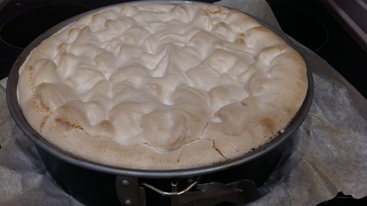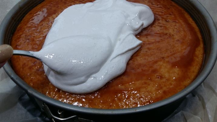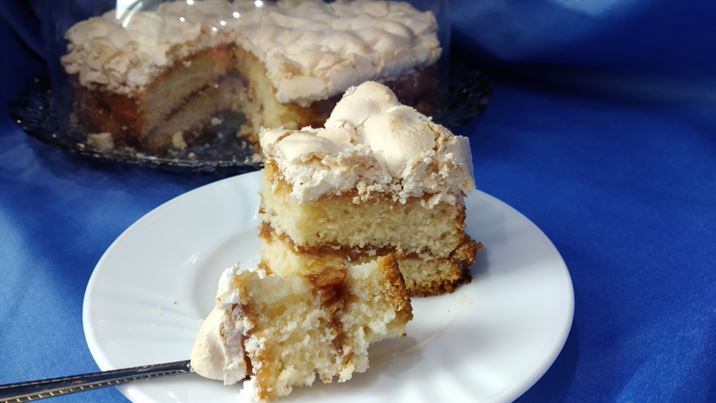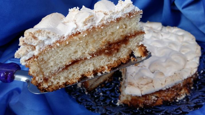 Ще ви е нужна тортена форма с подвижи стени, чийто диаметър е 26 см. Разбъркваме в дълбока купа двете яйца (без единия белтък който отделяме за целувчената смес) със захарта. Прибавяме ванилията, киселото мляко, мазнината, брашното и содата бикарбонат в моя случай ползвах бакпулвер, става по пухкава. Готовата смес разделяме на две. Половината изсипваме в намаслена и застлана с хартия тавичка с големина 26 см и изпичаме на 180С. Изваждаме блата, намазваме го с мармалад изливаме върху него останалата смес и запичаме отново до готовност. През това време в подходяща дълбока купа смесваме отделения белтък със захарта, ванилията и капките отцет до получаване на твърда смес която като обърнете купата не трябва да пада. Изваждате изпечената торта до суха клечка. Намазвате я отгоре отново с мармалад и разпределяте върху мармалада целувчената смес и с помощта на виличка надигате като пламъци на свещ печете за 5-6 минути в предварително загрята на 220 градуса фурна само на горен реоан до бледо кафяв цвят. След като я извадите от фурната оставете да се охлади и след това я нарежете по ваше желание. Пробвайте и споделете. Да ви е сладко!