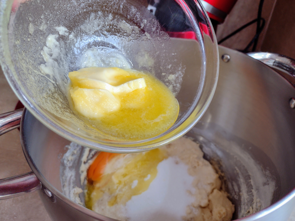 Към втасалото тесто прибавете яйцето, захарта и разстопеното масло.