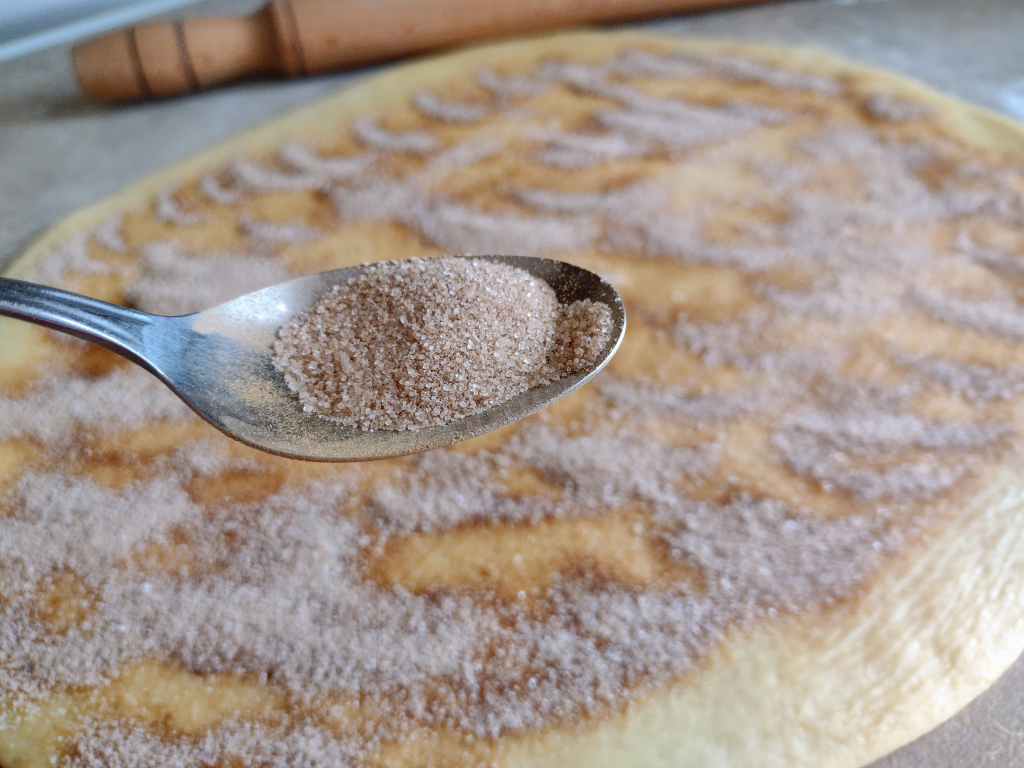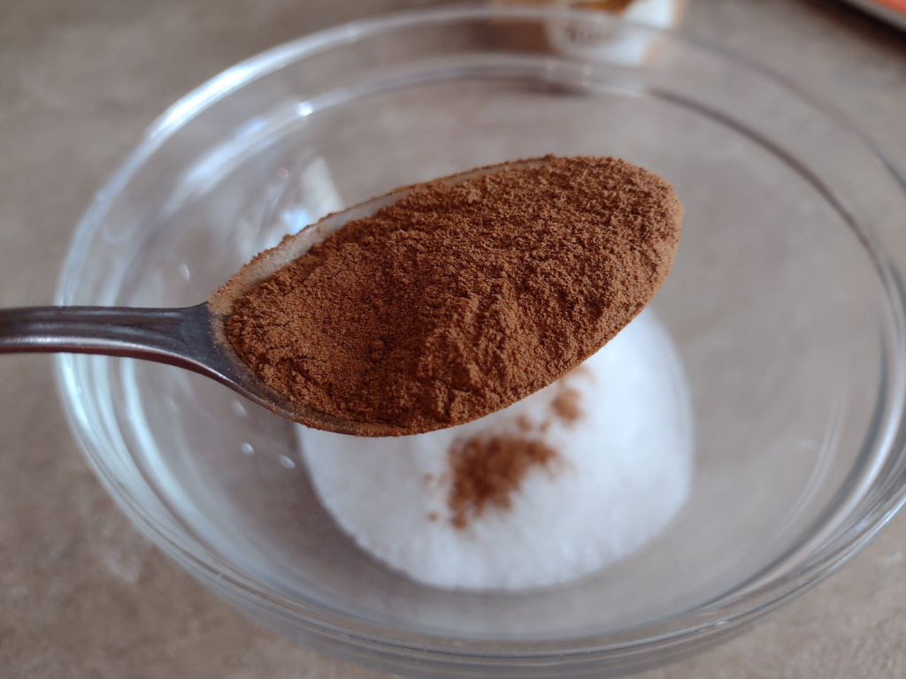 През това време смесете захарта с канелата за поръсване.