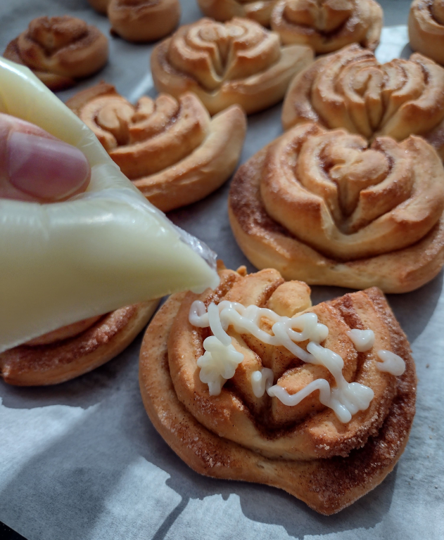 Затоплете млякото и в него разстворете маята, прибавете 300 гр. брашно и разбъркайте добре. Оставете да втаса за 20-25 минути. Към втасалото тесто прибавете яйцето, захарта и разстопеното масло. Разбъркайте отново,докато сместа се хомогенизира и на два пъти прибавете останалата част от брашното. Полученото тесто оставете отново за 20 минути да втаса. През това време смесете захарта с канелата за поръсване. Разделете втасалото тесто на две равни части. Разточете всяка част на кора с дебелина около 5-6 мм. Намажете с разстопено масло и поръсете обилно с канелата и захарта. Равийте на руло и разрежете по ширина на филйки със ширина около 3-4см. Във всяко парченце направете разрез с нож, но не до края и го отворете леко с ръка. Така направете и с втората част от тетстото. Наредете кифличките в намазнена или в застлана с хария за печене тава. Оставете да втасат 15 минути. Печете в предварително загряда на 180* градуса фурна за около 30-35 минути за златис цвят. Пригответе глазурата като разбъркате всичките съставки до напълно гладък крем. Още горещи намазвате обилно с глазурата. Пробвайте и споделете! Да ви е сладко!❤️