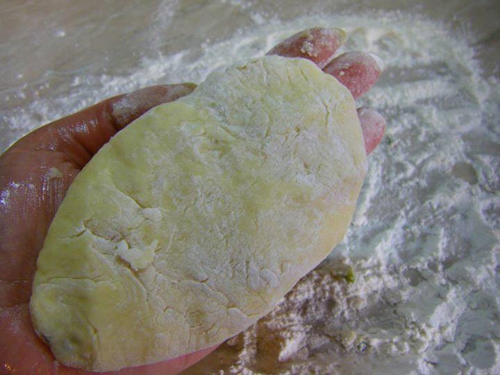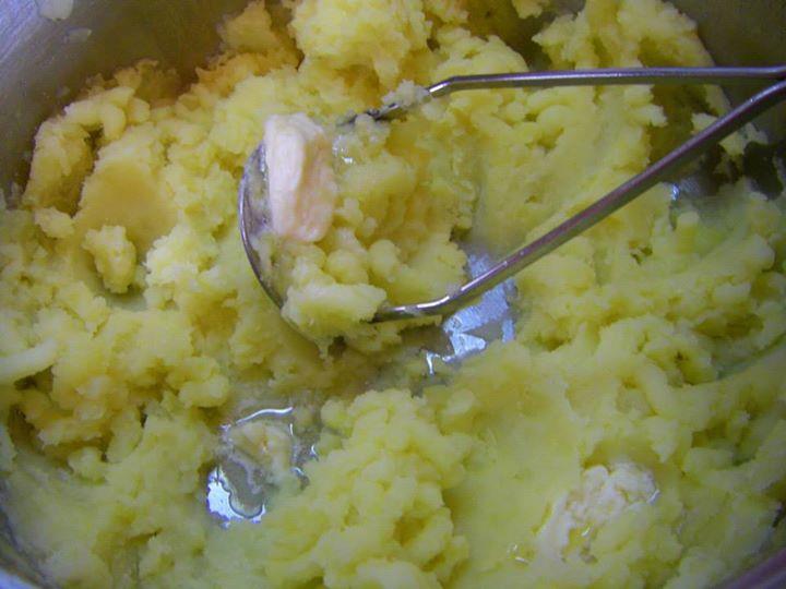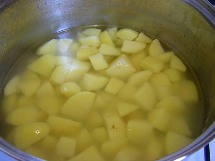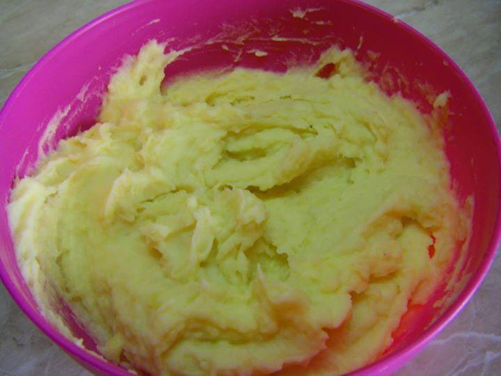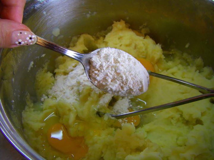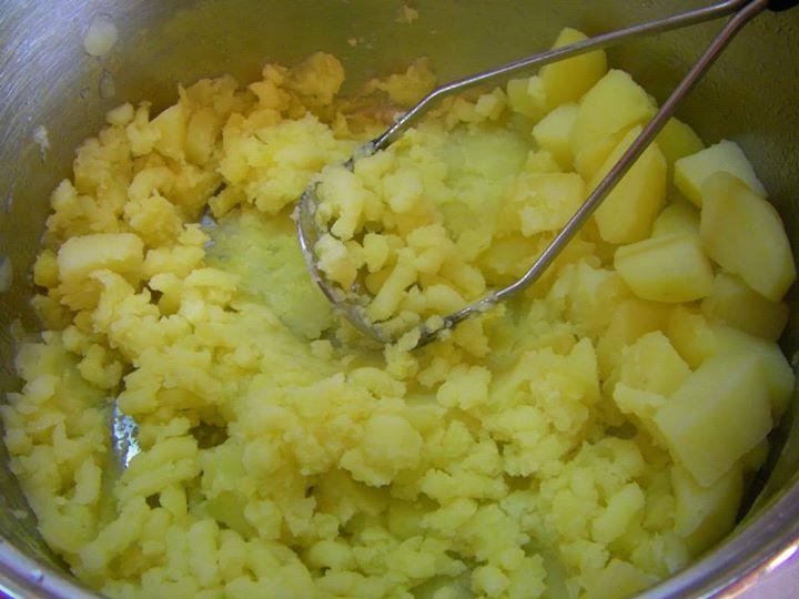 Сварете картофите, нарязани на едри кубчета. След като омекнат, ги намачкайте на пюре и посолете. Добавете маслото, разбъркайте добре, после прибавете яйцата и брашното. Омесете до еднородна смес и оставете да изстине напълно.