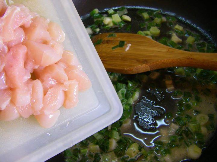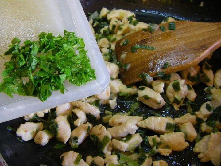 Добавете пилешкото месо, нарязано на малки парченца, и запържете до готовност.