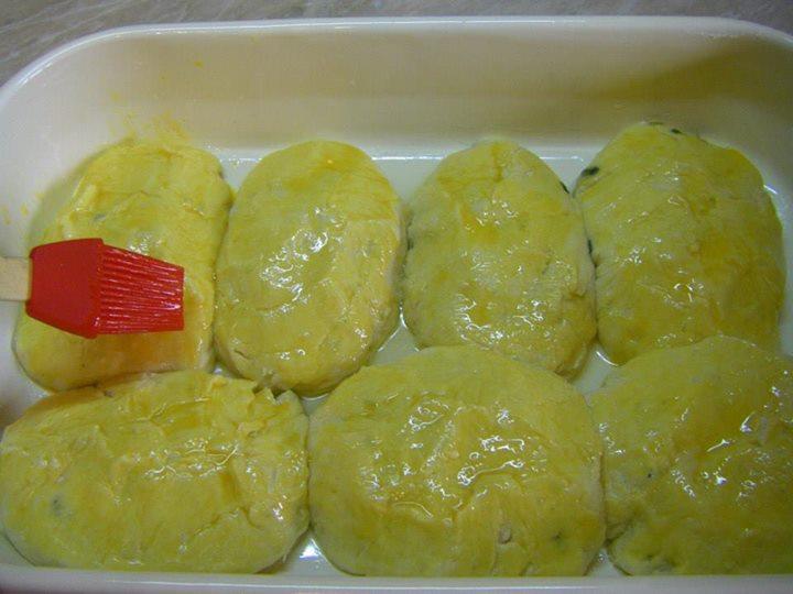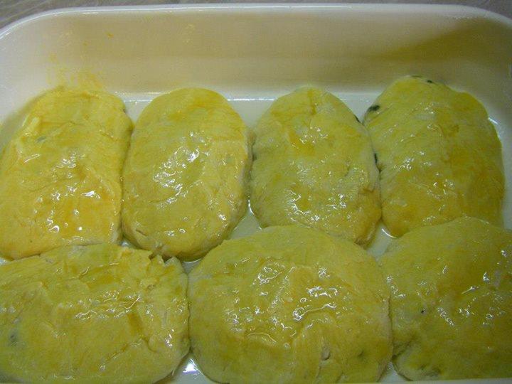 Подредете ги в намазнена тава, намажете ги с разбит жълтък.