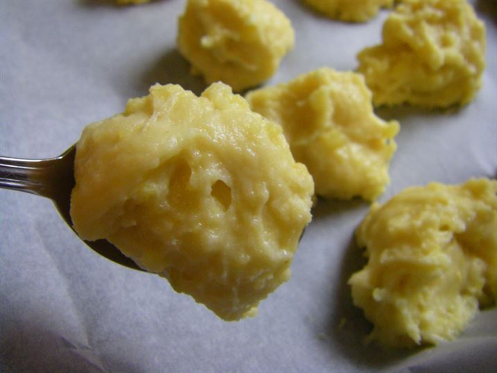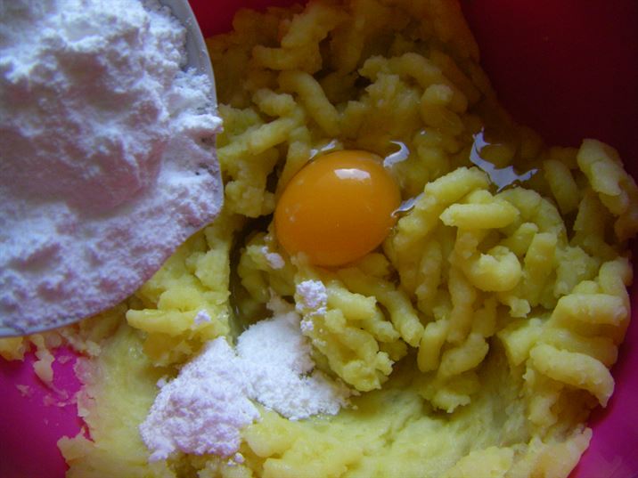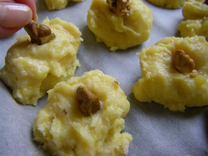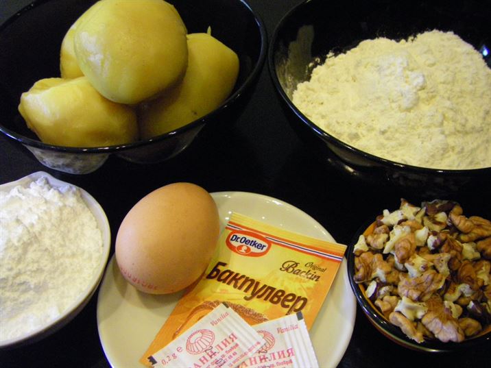 КАРТОФИТЕ СЕ ПАСИРАТ И КЪМ ТЯХ СЕ ДОБАВЯ ЯЙЦЕТО С ПУДРАТА ЗАХАР, СЛЕД ТОВА БАКПУЛВЕРА И ВАНИЛИЯТА. НАКРАЯ СЕ ПРИБАВЯ И БРАШНОТО. ЗАМЕСВА СЕ МЕКО ТЕСТО, ОТ КОЕТО С ПОМОЩТА НА ЛЪЖИЦА СЕ ОФОРМЯТ СЛАДКИТЕ, А МОЖЕ ДА ЗАМЕСТИТЕ ЛЪЖИЦА СЪС ШПРИЦ ТОГАВА ЩЕ ПОЛУЧИТЕ РОЗИЧКИ. ДЕКОРИРАЙТЕ СЛАДКИТЕ С ОРЕХЧЕ И ПЕЧЕТЕ НА УМЕРЕНА ФУРНА НА 180 ГРАДУСА ЗА 20-25 МИНУТИ ДО ЗЛАТИСТ ЦВЯТ. ПРОБВАЙТЕ И СПОДЕЛЕТЕ. ДА ВИ Е СЛАДКО.