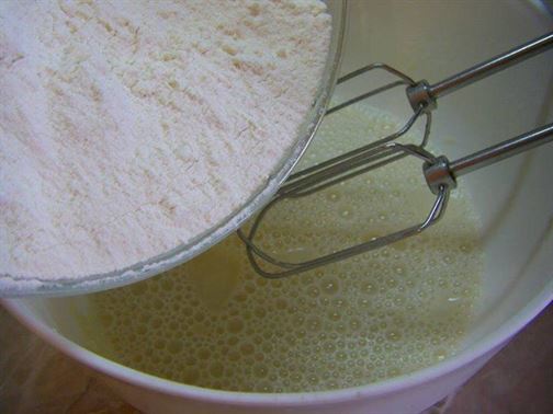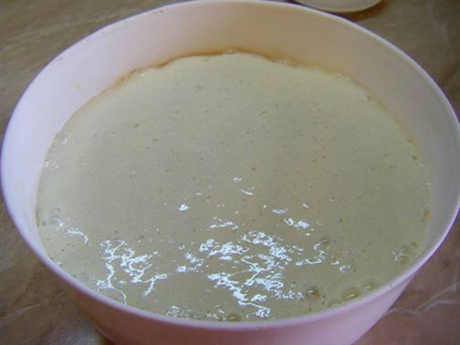 В подходяща дълбока купа размийте маята в топлата вода. Без да чакате да втаса, добавете брашното, солта и захарта. Разбъркайте добре — сместа трябва да е гъста като боза.