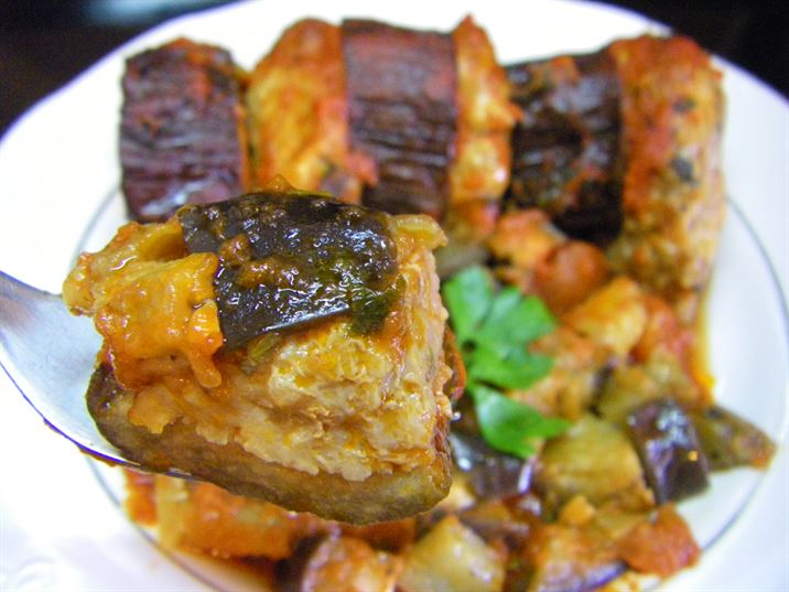 НАРЕЖЕТЕ ПАТЛАДЖАНА НА ДЕБЕЛИ ШАЙБИ И ГО ОСТАВЕТЕ ЗА 20 МИНУТИ В ПОДСОЛЕНА ВОДА, ЗА ДА СЕ МАХНЕ ГОРЧИВИНАТА. ПОСЛЕ ГО ИЗМИЙТЕ ПОД ТЕЧАЩА СТУДЕНА ВОДА. ОМЕСЕТЕ КАЙМАТА С МАЛКО РИГАН, НАСТЪРГАН НА СИТНО КРОМИД ЛУК И ЕДНА ПРЕСОВАНА СКИЛИДКА ЧЕСЪН. ОФОРМЕТЕ КЮФТЕТА ОТ ГОТОВАТА КАЙМА. В НАМАЗАНА С МАЛКО МАЗНИНА ТАВИЧКА С ГОЛЕМИНА 28 СМ, НАРЕЖДАТЕ КЕБАПА (КАКТО МОЖЕ ДА ВИДИТЕ ОТ СНИМКИТЕ "СТЪПКА ПО СТЪПКА") КАТО РЕДУВАТЕ КЮФТЕ, ПАТЛАДЖАН. ОСТАНАЛИЯ ПАТЛАДЖАН НАРЕЖЕТЕ НА КУБЧЕТА, КАКТО И ЗЕЛЕНАТА ЧУШКА, ДОМАТИ ТЕ, КАТО ТЯХ ПРЕДВАРИТЕЛНО ГИ ОБЕЛВАТЕ. СМЕСВАТЕ НАРЯЗАНИТЕ ЗЕЛЕНЧУЦИ В ДЪЛБОКА КУПА, ПРИБАВЯТЕ НАРЯЗАНИ НА СИТНО 2-3 СКИЛИДКИ ЧЕСЪН. ПОРЪСВАТЕ ЗЕЛЕНЧУЦИТЕ С МАЛКО РИГАН, СОЛ НА ВКУС И 2-3 СУПЕНИ ЛЪЖИЦИ ОЛИО. РАЗБЪРКВАТЕ ДОБРЕ И С ПОЛУЧЕНАТА СМЕС ЗАПЪЛВАТЕ ПРАЗНАТА ЧАСТ В СРЕДАТА НА ТАВАТА. ОТГОРЕ ПОРЪСВАТЕ СЪС СИТНО НАРЯЗАН МАГДАНОЗ. ЗАВИВАТЕ С АЛУМИНИЕВО ФОЛИО И ПЕЧЕТЕ ЗА 45-50 МИНУТИ НА 200 ГРАДУСА, КАТО ПОСЛЕДНИТЕ НЯКОЛКО МИНУТИ МАХАТЕ ФОЛИОТО И ЗАПИЧАТЕ ЛЕКО ЯСТИЕТО. ПРИГОТВЯТЕ ДОМАТЕНИЯ СОС, КАТО В ПОДХОДЯЩА ТЕНДЖЕРА СЛАГАТЕ 1-2 СУПЕНИ ЛЪЖИЦИ ОЛИО, ИЗСИПВАТЕ ДОМАТЕНОТО ПЮРЕ, МАЛКО РИГАН, МАЛКО СОЛ, ЗАЩОТО ВЕЧЕ СТЕ ПРИБАВИЛИ СОЛ НА ЗЕЛЕНЧУЦИТЕ И ЩИПКА ЗАХАР. ОСТАВЯТЕ СОСА НА УМЕРЕН ОГЪН ДА СЕ СГЪСТИ И СЛЕД КОЕТО ЗАЛИВАТЕ КЕБАПА СЪС СОСА. ВРЪЩАТЕ ЯСТИЕТО ОБРАТНО ВЪВ ФУРНАТА ЗА 10 МИНУТИ, КОЛКОТО ДА ЗАВРИ И ГО МАХАТЕ. СТАВА НЕВЕРОЯТНА ВКУСОТИЙКА. ЯСТИЕТО Е ОТ ТУРСКАТА КУХНЯТА, НО С МАЛКИ ПРОМЕНИ ОТ МОЯ СТРАНА. ПРОБВАЙТЕ И СПОДЕЛЕТЕ. ДА ВИ Е СЛАДКО.
