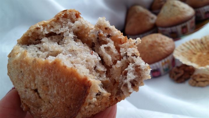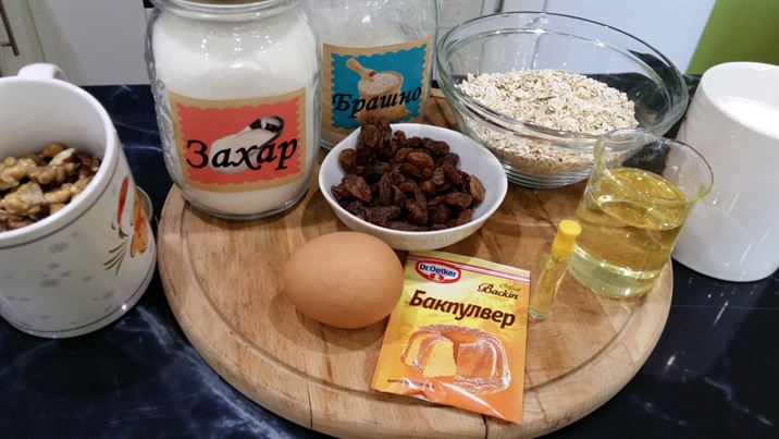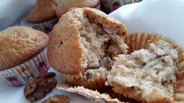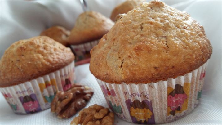Накиснете овесените ядки в прясното мляко за 10-15 минути. В друга дълбока купа разбийте яйцето с олиото. Добавете към яйчената смес вече омекналите овесени ядки. Сипете стафидите. Прибавете ванилията.Отделно разбъркайте брашното, захарта и бакпулвера. Сипете към горната смес. Добавете едро нарязаните орехи. Разбъркайте добре. Напълнете 12 формички за мъфини. Изпечете ги за 25-30 минути във фурната предварително загрята на 180 градуса. Пробвайте и споделете. Да ви е сладко!