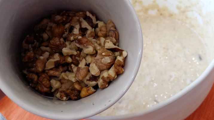 Добавете едро нарязаните орехи. Разбъркайте добре.